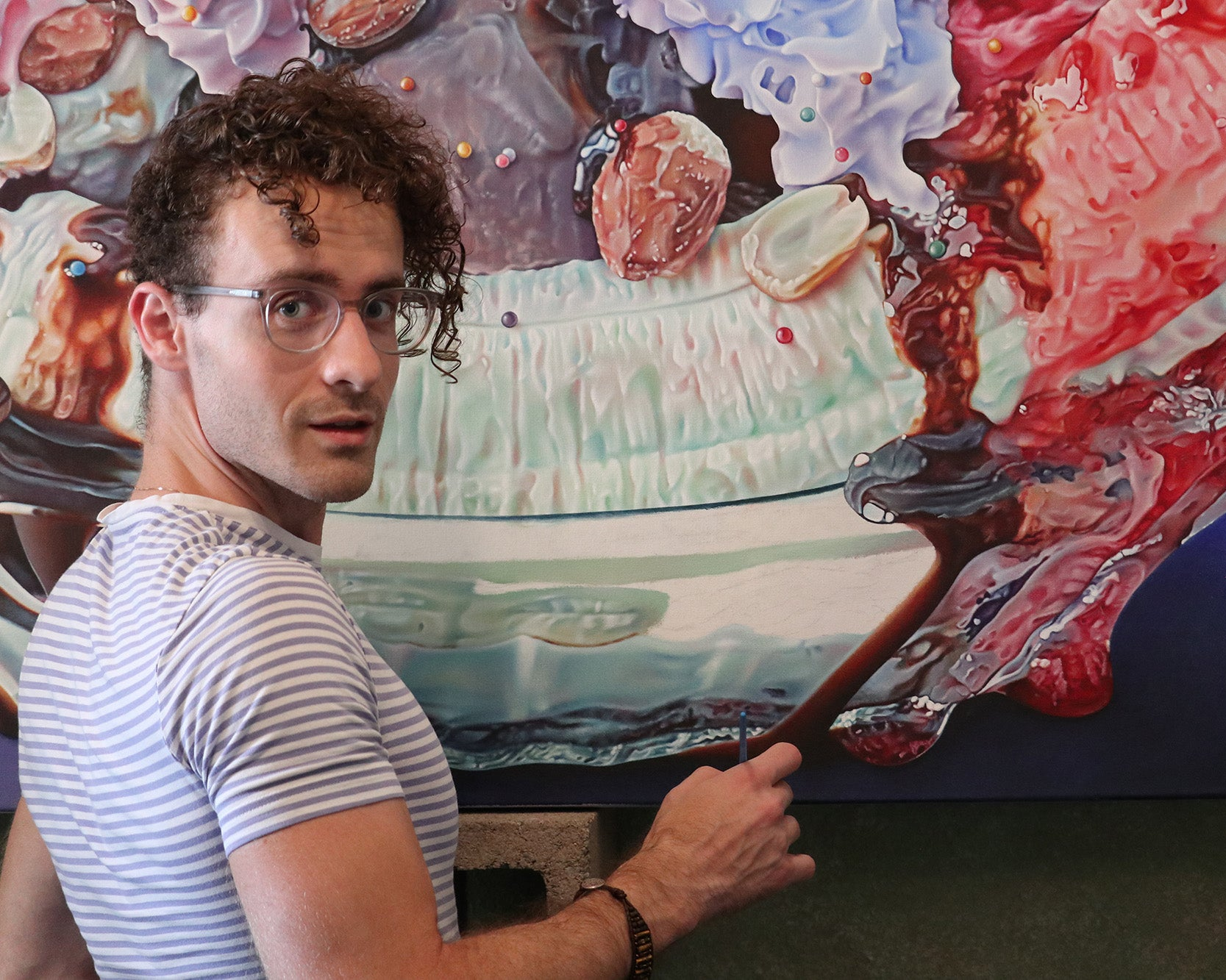 Since an early age, Nick A. Erickson has delved into the realm of aesthetic, particularly the kind that fluffs up nostalgia. A pop artist at heart, Nick gravitates toward the visual cues of a high-fructose universe. The diners, parlors, and bakeries of retro pastime have consistently inspired Nick’s work, which he believes is a pastel, multicolored window into Americana culture. When it comes to painting desserts and temptations, he strives to realistically render the varying textures of cream, cake, and cherry – so lifelike that you can almost taste them. Imbuing his desserts with neon-colored tones and highlights, Nick embraces the spectrum of the sweet. While ice cream and frosting are often consumed quickly, Nick A. Erickson’s artwork can be eaten through the eyes, infinitely, without any fear of melting away.